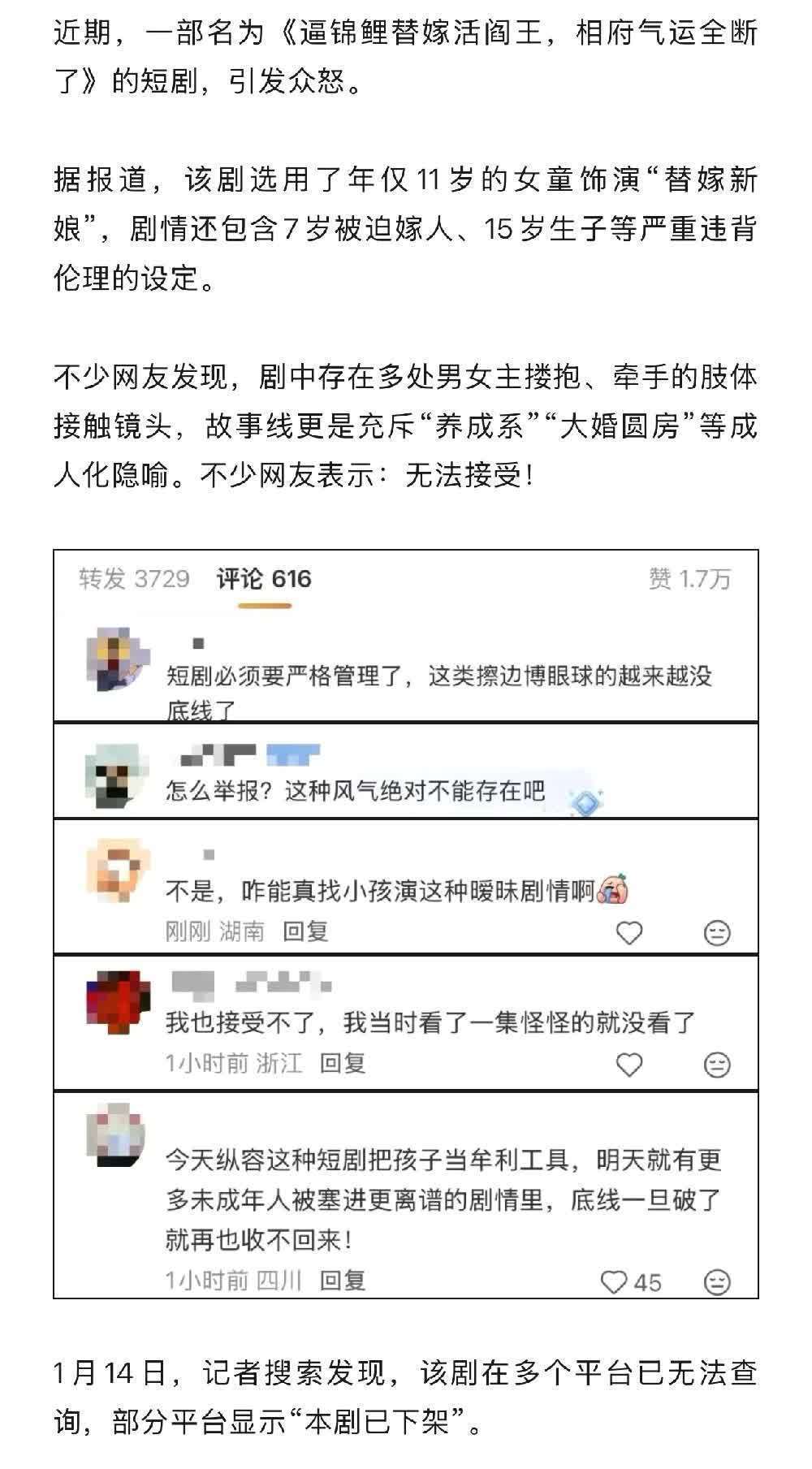 涉事短剧已全网下架,但同童星主演的另一婚恋题材短剧《首辅家的锦鲤妻》仍可播放。广电部门回应“已记录情况”,具体处罚尚未公布。